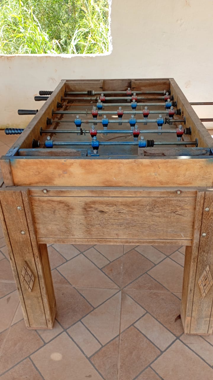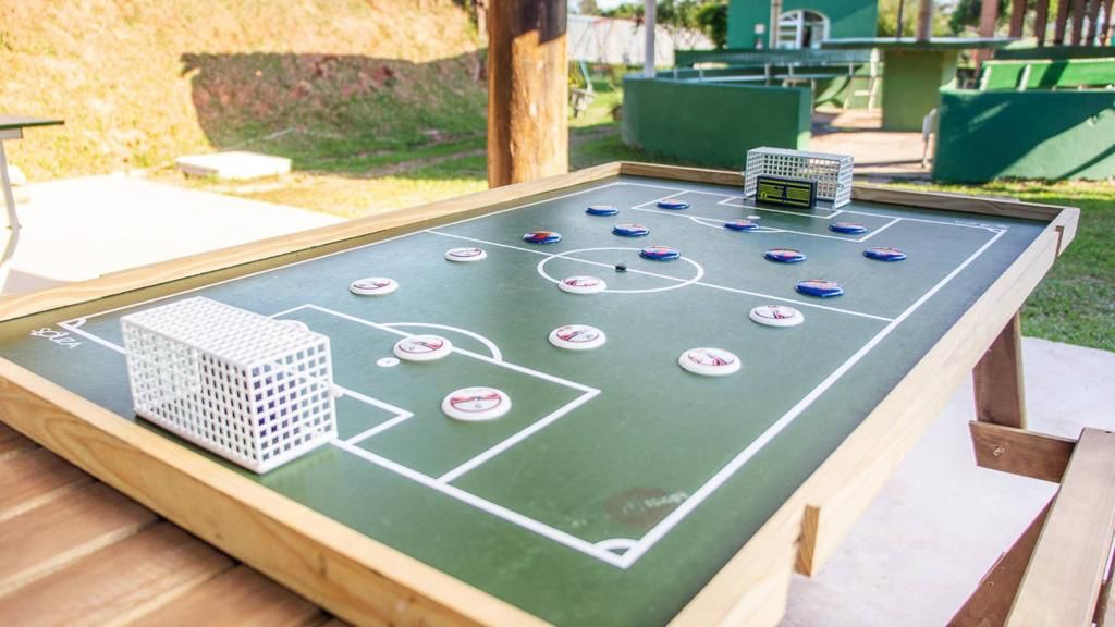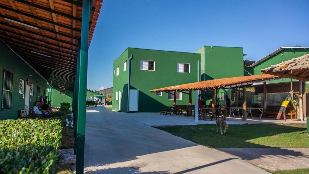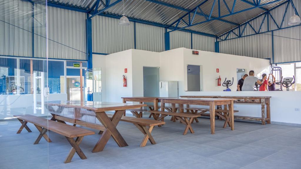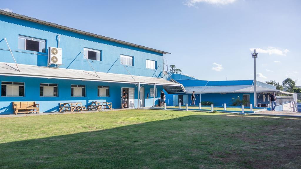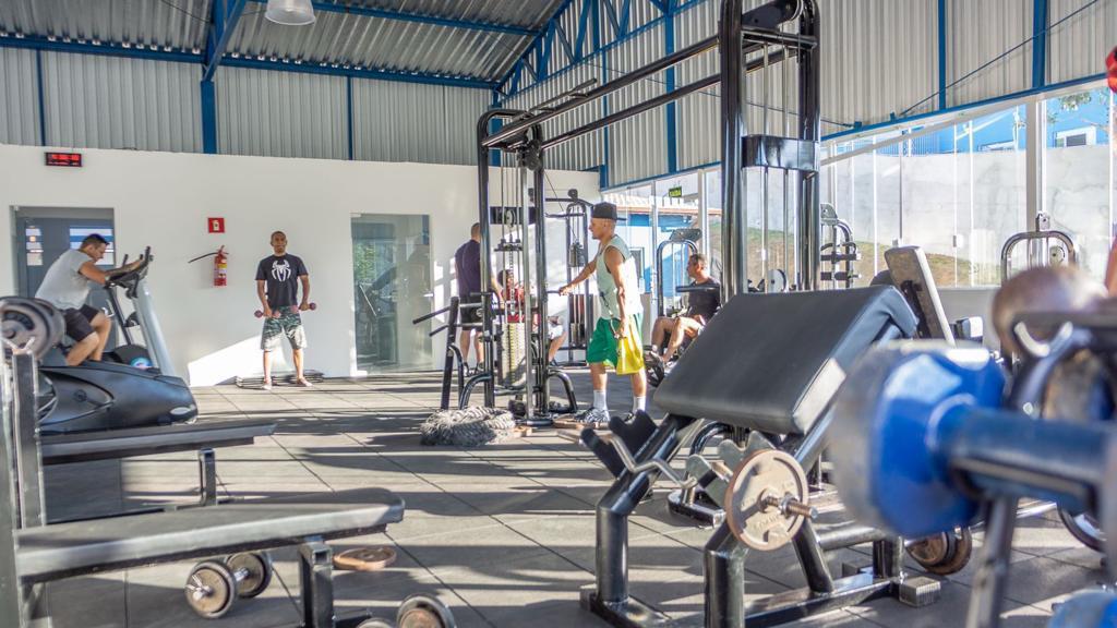 Ambientes equipados com piscina, academia, campo e quadra para esportes, refeitório, além de uma área ampla.